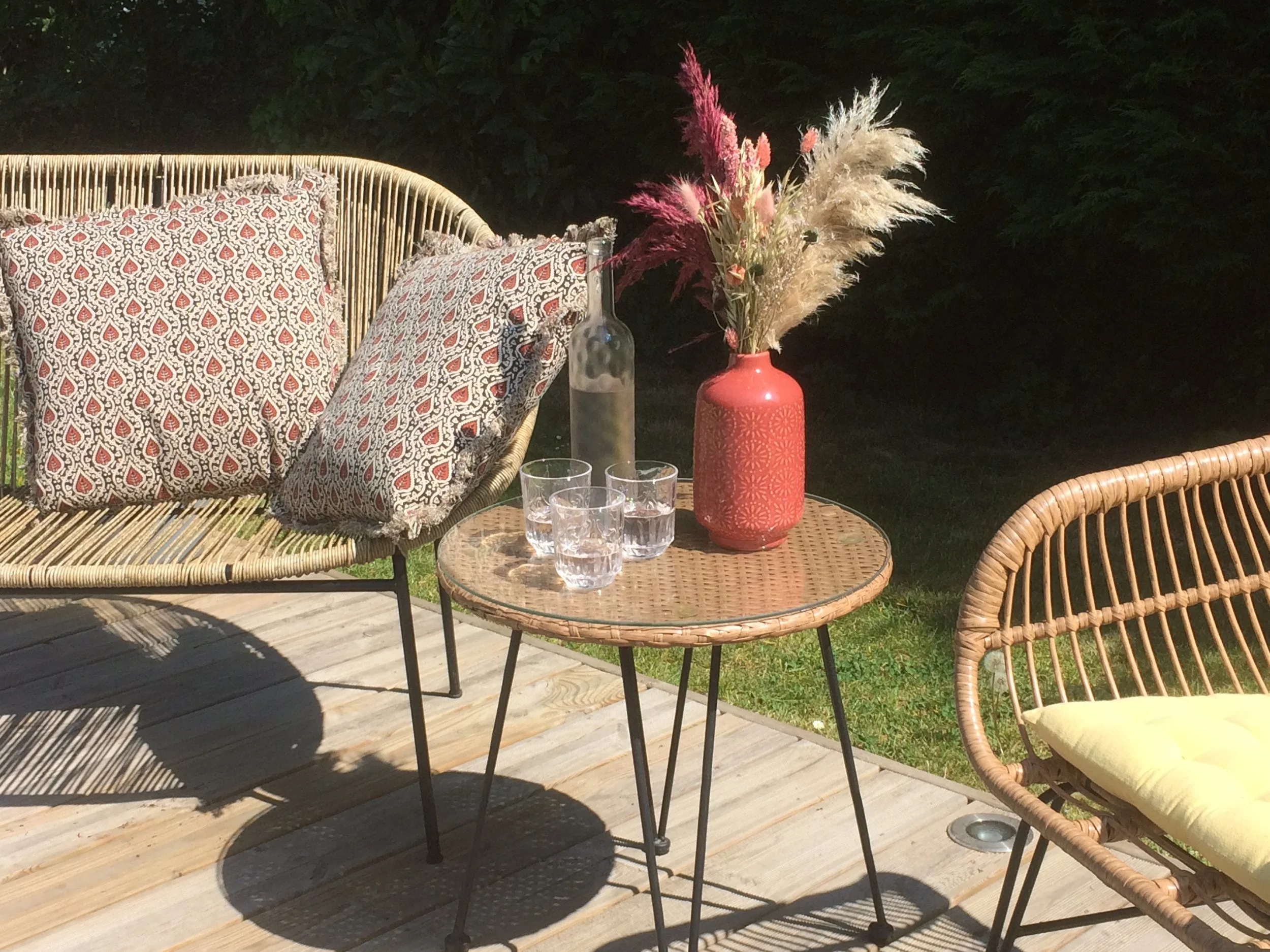 Au jardin comme sur la terrasse les textiles apportent de la douceur, de la couleur, un effet cocooning. Les coussins s’harmonisent au plaid, à un tapis d’ extérieur, à la nappe, aux serviettes de table. Concernant l’ambiance de l’espace extérieur, jardin ou terrasse, elle est un prolongement de l’ambiance intérieure ou toute autre. Mon conseil ? Cassez les codes de votre déco intérieure pour vous retrouver dans un tout autre univers et qui vous apportera d’autres émotions que celles que vous procure votre salon.